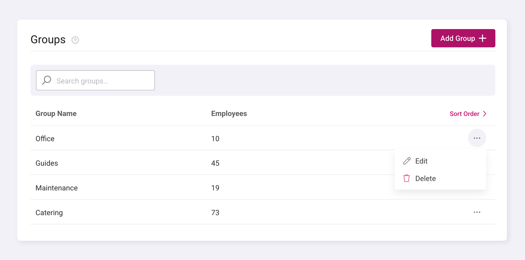 Add new groups by clicking the 'Add Group' button at the top of the page. Enter the group name, then click the Save button. Your new group will be added to the list, ready for you to start assigning it to employees.