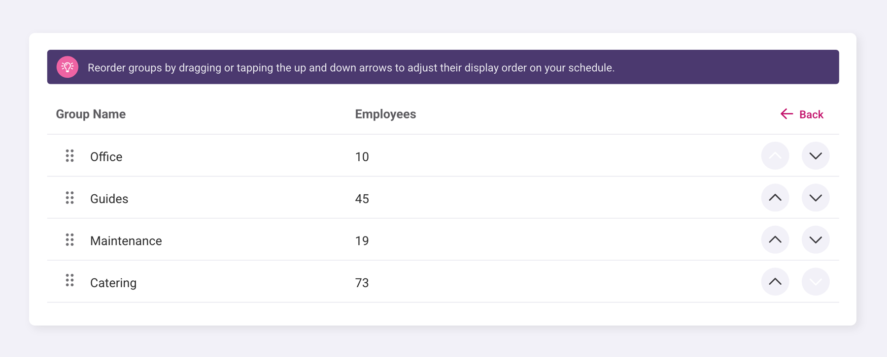 Groups are a tool to allow you to customise your schedule for your company. Rather than only being able to view employees alphabetically or grouped by job role you can create custom groups to categorise your team, grouping all customer-facing employees together or ordering by department as you see fit.
