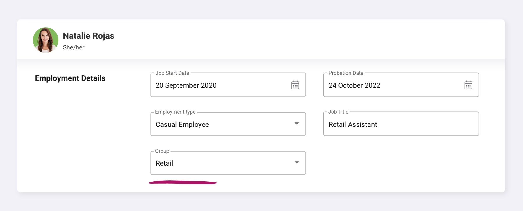 To assign an employee to a group, go to your team page and select the employee you'd like to assign a group to. Next, click on the 'Employment Details' and use the 'Employee Group' dropdown to select the group you'd like them to be assigned to.