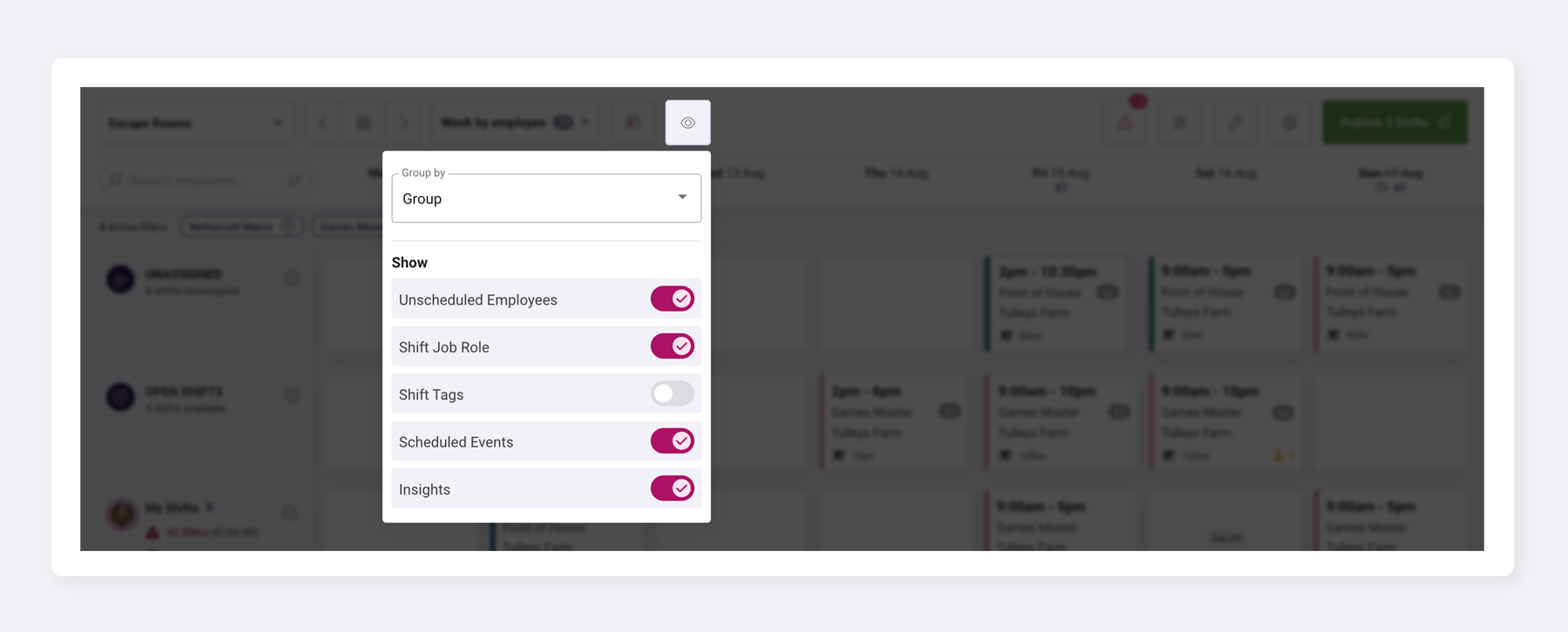 Once your groups are set up, you can choose to sort your employees by groups on the Schedule. Go to your Schedule page, click the 'View' menu at the top of page, and select 'Group' from the 'Group By' options.