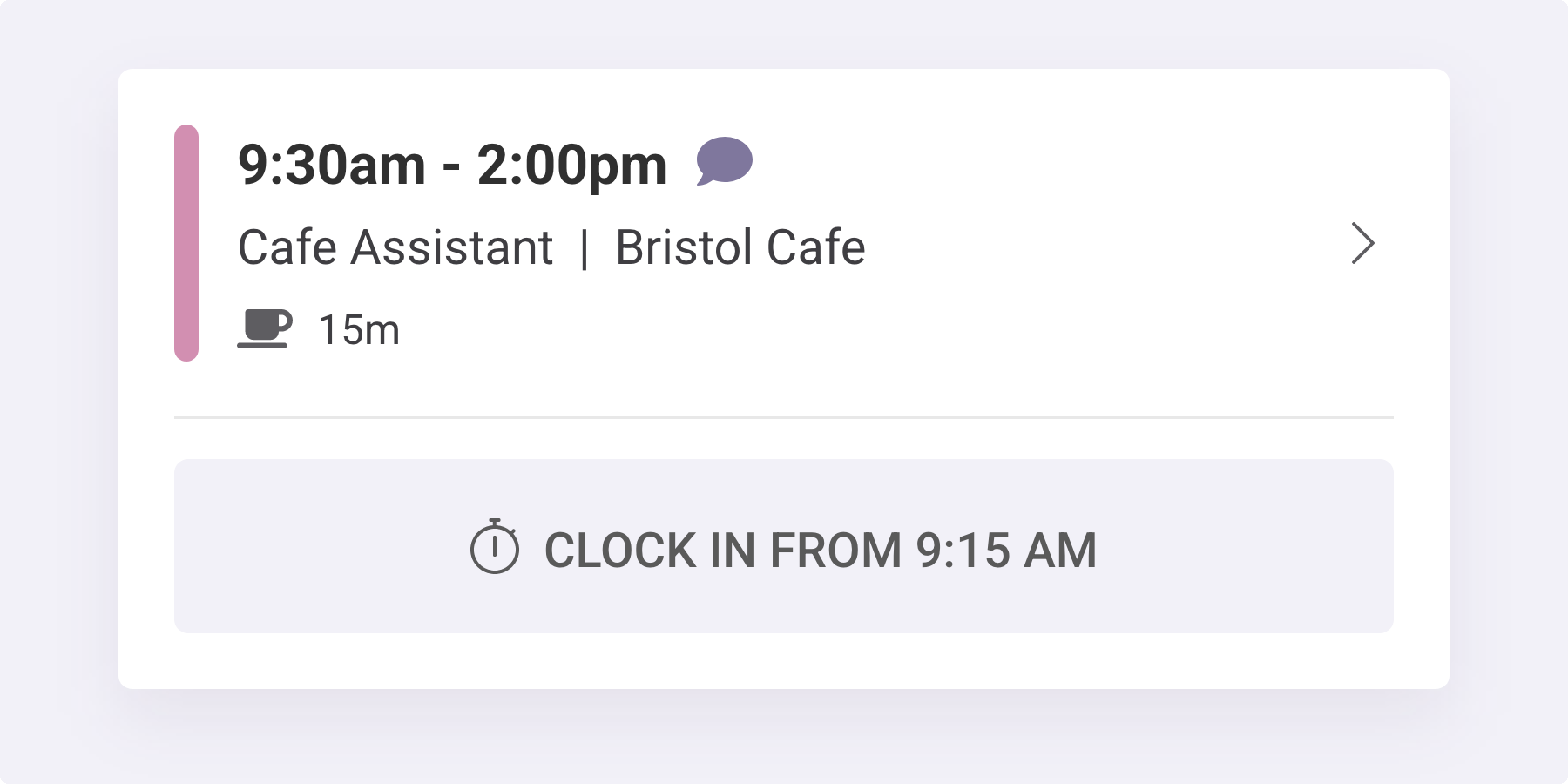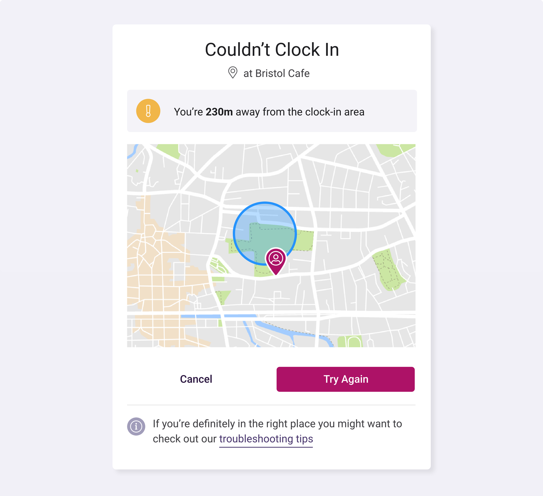 Each shift is tied to a location and your company can choose to only allow you to clock in if you're within a certain distance of the location. If you try to clock in when you're outside of that area then you'll be shown a map showing the shift location and you'll need to move closer before trying to clock in again.